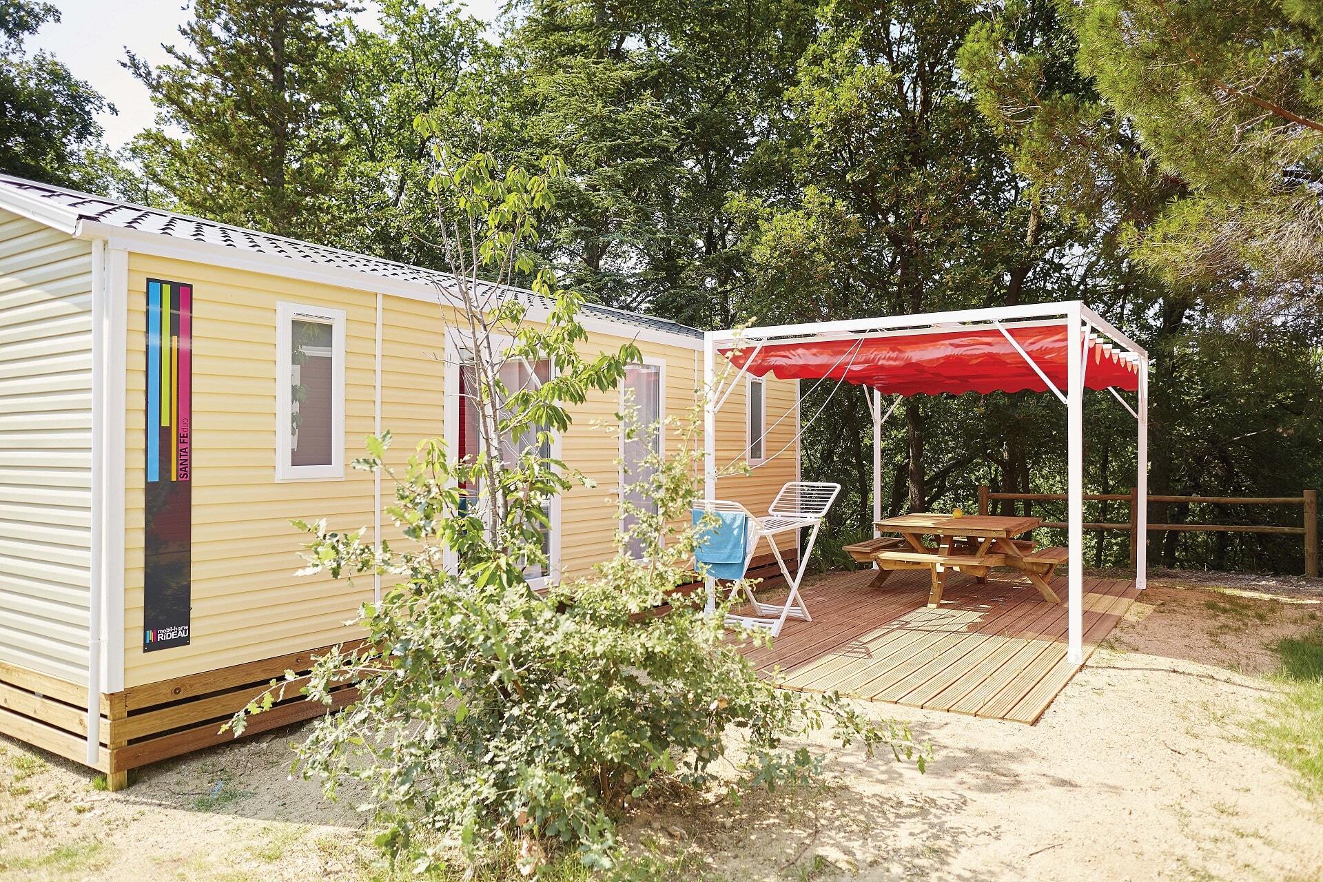Semi-covered or covered wooden terrace, on the ground or integrated with garden furniture and sun loungers.
